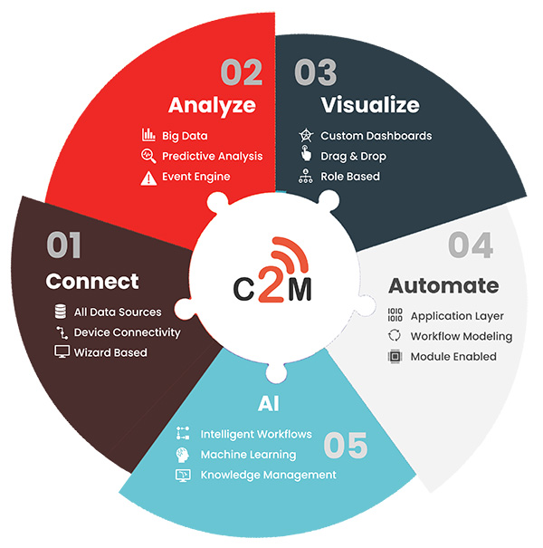 C2M combines connected data, analytics, dashboards, workflow automation, and AI into one platform that helps teams move faster and operate more efficiently.
